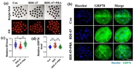 Effect of BDE-47 on early embryonic ER function in porcine. (a) A typical image of embryos stained with ER-Tracker Red. Scale bar, 100 μm. (b) A typical image of embryos stained with Hoechst 33342 (blue) and GRP78 (green). Scale bar, 100 μm. (c) Statistics on the relative amounts of ER in embryos of the control (Number of embryos, N = 79), BDE-47-treated (Number of embryos, N = 77), and BDE-47+PBA-treated (Number of embryos, N = 72) groups (3 replicates); Blue dots represent control embryos, red dots represent BDE-47-treated embryos, green dots represent BDE-47+PBA-treated embryos. (d) Statistics on the relative intensity of GRP78 fluorescence in embryos of the control (Number of embryos, N = 77), BDE-47-treated (Number of embryos, N = 57), BDE-47+PBA-treated (Number of embryos, N = 71) groups (3 replicates); Blue dots represent control embryos, red dots represent BDE-47-treated embryos, green dots represent BDE-47+PBA-treated embryos. The concentration of BDE-47 was 100 μM. The concentration of PBA was 75 μM. The mean ± SD is presented for the data. *, p < 0.05; **, p < 0.01.
