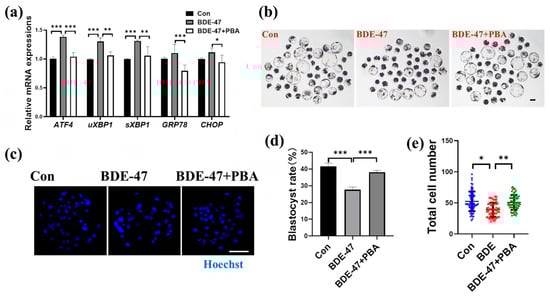 The ER and mitochondria are structurally and functionally related. Therefore, the effect of BDE-47 on early porcine embryonic ER function was also studied. The ER abundance and the expression of the ERS marker GRP78 were assessed. Compared to the control group, the ER abundance in the BDE-47-treated group was considerably reduced (0.87 ± 0.17; Figure 5a,c), but this decrease was restored with the addition of the ERS inhibitor 4-phenylbutyrate (PBA) (Figure 5a,c). Contrasted with the control group, the BDE-47-treated group’s level of the ERS marker GRP78 was dramatically higher (1.13 ± 0.17; Figure 5b,d) but was restored after the addition of PBA (Figure 5b,d). Moreover, BDE-47 upregulated the expression levels of ERS-related genes in embryos (ATF4: 1.38 ± 0.03, uXBP1: 1.30 ± 0.06, sXBP1: 1.31 ± 0.02, GRP78: 1.10 ± 0.15, and CHOP: 1.11 ± 0.08; Figure 6a), and these changes were restored after the addition of PBA (Figure 6a). Although there was no significant difference in mRNA upregulation between GRP78 and CHOP, there was a trend of mRNA upregulation, whereas the mRNA expression was significantly downregulated after the addition of PBA compared with the BDE-47 exposure group. After BDE-47 treatment, the blastocyst rate and total cell number of embryos decreased; however, inhibiting ERS with PBA reversed the decrease in blastocyst rate and total cell number in the BDE-treated group (Figure 6b–e). These results show that BDE-47 treatment impairs ER function and embryo development, but PBA can reverse this impairment.