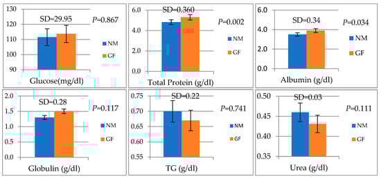 The analysis of blood biochemical parameters in GF and NM rabbits is presented in Figure 1. Total Protein (g/dL) and albumin (g/dL) were significantly higher in GF than in NM rabbits (p = 0.02 and 0.034, respectively).