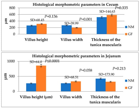 Comparing the histological morphometric parameters between GF and NM rabbits in the cecum and jejunum. Means and standard deviations (SD), and the differences were considered significant at p < 0.05.