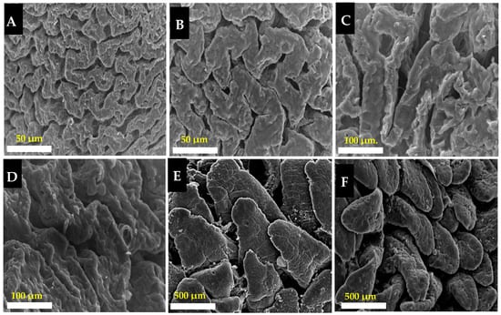 SEM photographs of villi of the cecum and jejunum in NM and GF breeds. (A,C) photographs showed the villi in the cecum of NM. (B,D) photographs showed the villi on the cecum of the GF breed. (E,F) photographs of the villi on the jejunum of the NM and GF breeds, respectively. Scale bars: (A,B) 50 µm; (C,D) 100 µm; (E,F) 500 µm.