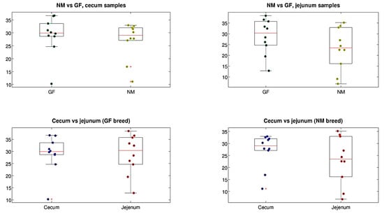 The dataset comprised a total of 40 samples, derived from 2 organs (jejunum and cecum) and 2 rabbit breeds (NM and GF). Each combination had 10 independent replicates. The comparison among the experimental categories comprised three levels of analysis: (a) Breed: comparison between microbiota from GF and NM rabbits (as a whole, considering both organs); (b) Organ: comparison between microbiota from caecum and jejunum (as a whole, considering both breeds); and (c) stratified analyses comparing organs within the same breed and breeds in samples from the same organ.