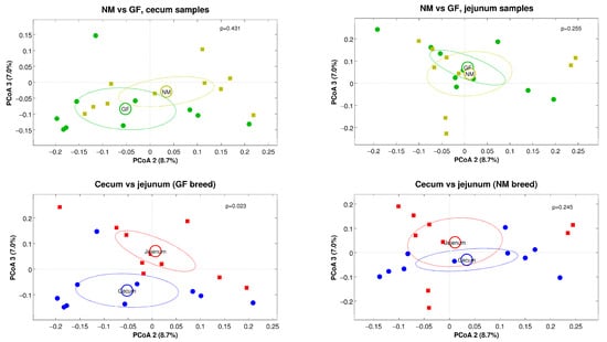 Alpha-diversity estimations for cecum and jejunum samples in both rabbit breeds (NM and GF) showed that the diversity across the different experimental conditions was comparable for all the metrics analyzed (with the only exception of a significant difference between jejunum and cecum samples of the GF breed, p = 0.011), as shown in Figure 4. For beta-diversity analysis, a significant difference was found for the intestine tract experimental variable, with cecum and jejunum samples being different (regardless of the rabbit breed) for both the unweighted and the weighted UniFrac distances (p = 0.022 and p = 0.001, respectively, data not shown). Stratifying by organ and breed, a significant difference was found between cecum and jejunum samples of the GF breed. No difference was found for the NM breed when comparing the two breeds for jejunum and cecum samples separately (Figure 5), this statement is right
