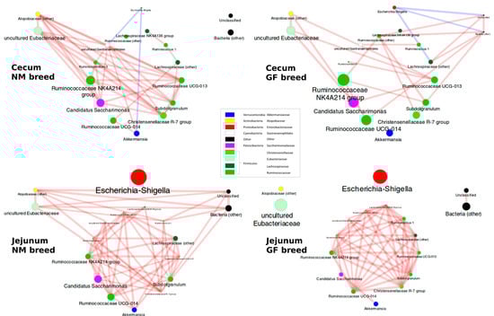 The Co-Occurrence patterns among the bacterial genera in the cecum and jejunum in NM and GF breeds, separately. Patterns here depict the significant (p < 0.05) correlations among the bacterial genera for the four experimental classes. Node size is proportional to the average abundance of the genera in the experimental condition, and the fill color follows the taxonomic classification of the genera. The edges size is proportional to the strength of correlation, whereas the edges color is blue for negative correlations and red for positive correlations.