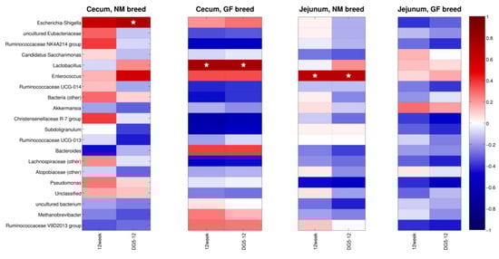 Average relative abundances and the standard deviation (between parentheses) at genus level for microbiota in the cecum and jejunum in the GF breed. The average abundance over the replicates (n = 10) of the same condition, as well as (between parenthesis) the standard deviation, are shown. The p-value refers to that of a two-tailed Mann–Whitney U-test. “*” indicated statistical significance (p < 0.05). Only genera with an average abundance > 1% were shown. Average abundances at higher levels are calculated by summing up the genera belonging to each order and phylum.