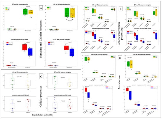 The functional prediction of gut microbiome in rabbit breeds NM and GF, separated by 0.008 organs (cecum and jejunum). (A) Signaling and cellular processes; (B) Genetic information processing; (C) Cellular processes; (D) Metabolism.