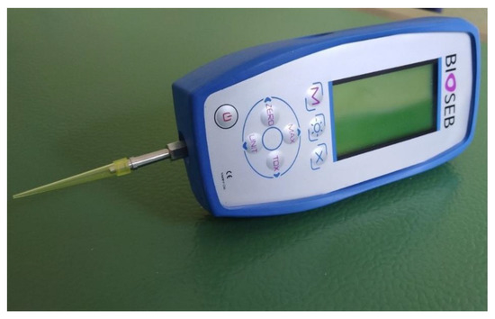 Among tools that used in various studies to assess pain are the UMPS [44] and the algometer. The latter is an electronic device used for the quantitative measurement of the mechanical pain threshold based on Von Frey filaments [45]. It consists of the main stem, handle, memory recorder, and nozzles (tips). A metallic probe is screwed into the main stem and, with pressure, activates the actuator. Finally, a plastic polypropylene tip with length 3 cm and 0.78 mm2 disk surface area is adjusted to the probe (Figure 1). Gradual pressure is applied at a specific point to produce a non-traumatic painful mechanical stimulus. Specifically, the pressure is applied to the skin through the nozzle, and the recording device numerically displays and stores the maximum reading in grams. The measurement uses a highly accurate sensor of with a maximum capacity of 5000 g. This ensures the precise capture and display of the maximum force, even for short and low force peaks, enabling the testing of a wide range of the animal’s pain sensitivity.