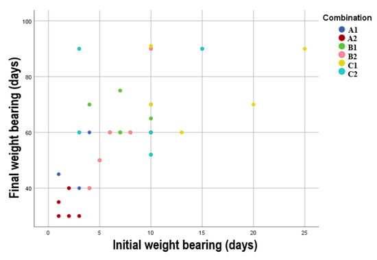 Scatterplot showing the correlation between initial and final limb weight bearing for all the subgroups.