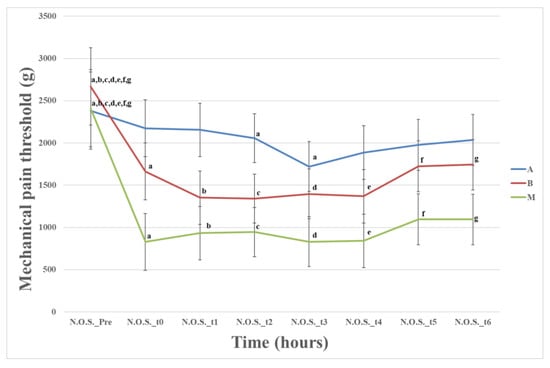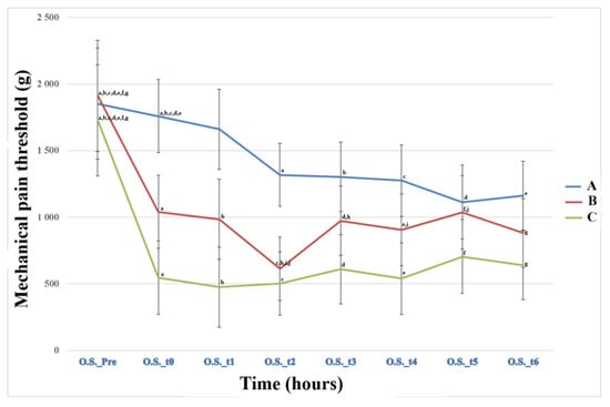 The analysis of the results demonstrated statistically significant differences in the mechanical pain threshold between the animals in Groups A and C at multiple time points. Specifically, significant differences were observed at t0 (p = 0.004), t1 (p = 0.0010), t2 (p = 0.022), and t4 (p = 0.022), with Group C exhibiting a lower pain threshold compared to Group A. On the other hand, between Groups A and B, a statistically significant difference in the mechanical pain threshold was found only at the time point t2 (p = 0.045) (Figure 3).