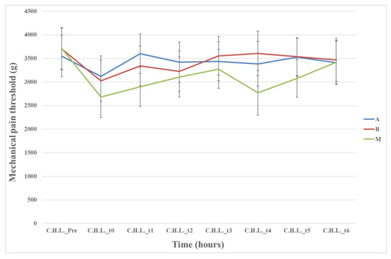 To compare the central tendency among the three groups of animals, both preoperatively and at time points t0–t6, regarding mechanical pain threshold measurements at the OS, measurements in a “healthy” area NOS, measurements in the CHL, and pain intensity measurements on the UMPS scale (excluding the preoperative measurement), we employed a two-way ANOVA method. This analysis involved one factor, “Group”, with three levels, as well as a within-subject factor considering repeated measures, “Time”, with eight levels (or seven for pain intensity measurements on the UMPS scale).