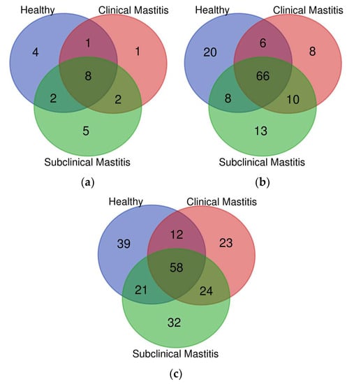 Representation of different taxa (distinct and shared) at different levels: (a) phylum, (b) family, (c) genus, in milk microbiota of Nili Ravi buffalo with different udder health statuses through Venn diagram.