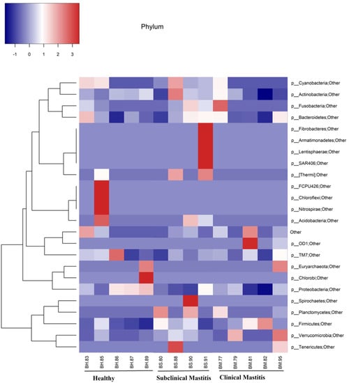 Representation of phylum level taxonomical composition in individual samples through heat map. Intensity of color shows the relative abundance of phyla in milk microbiota of Nili Ravi buffalo with different udder health statuses.