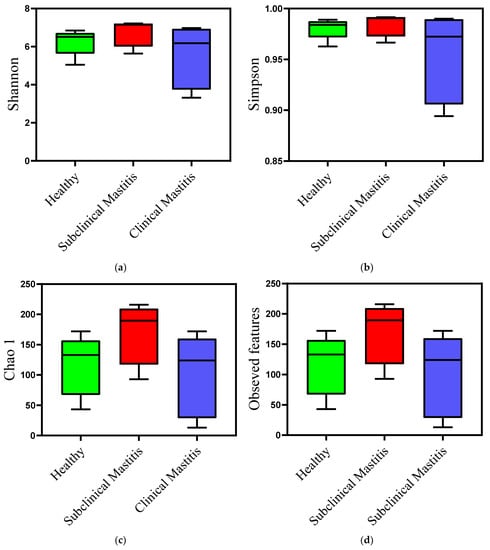 Diversity analysis using alpha diversity indices of microbiota of Nili Ravi buffalo milk with different udder health statuses: (a) Shannon diversity index, (b) Simpson diversity index, (c) Chao 1, (d) observed features.