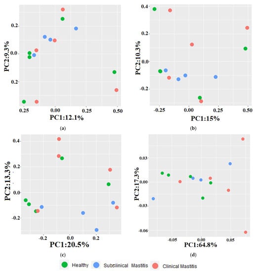 PCA plots representing beta diversity indices in Nili Ravi milk with different udder health statuses: (a) Jaccard index, (b) Bray-Curtis dissimilarity index, (c) unweighted, (d) weighted uniFrac metrics.