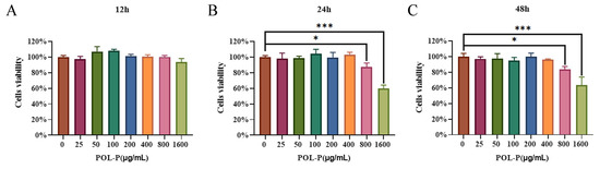Cytotoxicity of POL-P in IPEC-J2 cells: (A) effects of different concentrations (0–1600 μg/mL) of POL-P on the viability of IPEC-J2 cells after 12 h of treatment; (B) after 24 h of treatment; (C) after 48 h of treatment. Data are presented as mean ± SD (n = 3). *, p < 0.05 and ***, p < 0.001.