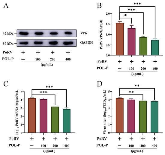 Different concentrations of POL-P inhibit PoRV infection. (A) Immunoblot analysis of VP6 protein levels in IPEC-J2 cells infected with PoRV and treated with different concentrations of POL-P (100, 200, and 400 μg/mL) for 24 h. (B) The expression levels of VP6 protein were normalized to those of GADPH. (C) IPEC-J2 cells were treated with different concentrations of POL-P (100, 200, and 400 μg/mL) and infected with PoRV for 24 h. Subsequently, absolute qRT-PCR assays were performed to analyze the collected cells. (D) PoRV viral titers were measured in IPEC-J2 cells treated with different concentrations of POL-P (100, 200, and 400 μg/mL) for 24 h. The cells and supernatants were collected for TCID50 tests. Data are presented as mean ± SD (n = 3). *, p < 0.05; **, p < 0.01, and ***, p < 0.001.