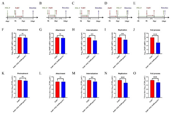 Effects of POL-P on mRNA and viral titers of PoRV during pretreatment, attachment, internalization, replication, and the full process. (A–E) Pattern diagrams of pretreatment, attachment, internalization, replication, and the full process. (F–J) Detection of PoRV mRNA during pretreatment, attachment, internalization, replication, and the full process. (K–O) Detection of viral titers of PoRV during pretreatment, attachment, internalization, replication, and the full process. Data are presented as mean ± SD (n = 3). **, p < 0.01, and ***, p < 0.001.