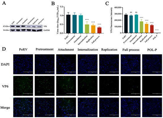 Effects of POL-P on VP6 protein of PoRV during pretreatment, attachment, internalization, replication, and the full process. (A) Immunoblot analysis of the VP6 protein levels in IPEC-J2 cells infected with PoRV and treated with POL-P (400 μg/mL) during pretreatment, attachment, internalization, replication, and the full process. (B) Levels of VP6 fluorescence protein expression analyzed in ImageJ, normalized to that of GADPH. (C) Intensity of VP6 protein expression analyzed in Image J. (D) Localization of PoRV VP6 protein (green) in IPEC-J2 cells, visualized with PoRV immunofluorescence during pretreatment, attachment, internalization, replication, and the full process (scale bars = 400 μm). Data are presented as mean ± SD (n = 3). ***, p < 0.001.