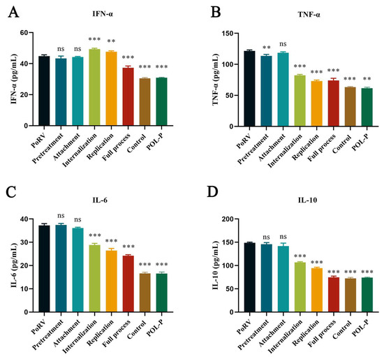 Using the ELISA method, we detected inflammatory factors secreted by IPEC-J2 cells. Compared with those in the PoRV group, during the internalization process, POL-P significantly decreased the expression levels of TNF-α, IL-6, and IL-10 cytokines, with inhibition rates of 32.32%, 22.58%, and 28.25%, respectively (p < 0.001, Figure 5A–C), and increased IFN-α expression by approximately 1.13-fold (p < 0.001, Figure 5D). Compared with the PoRV group, during the PoRV replication stage, POL-P treatment inhibited the production of TNF-α, IL-6, and IL-10 inflammatory factors in cells, with inhibition rates of 39.99%, 28.95%, and 36.54%, respectively (p < 0.01, p < 0.001, Figure 5A,C,D), and significantly increased IFN-α expression by approximately 1.08-fold (p < 0.01, Figure 5B).