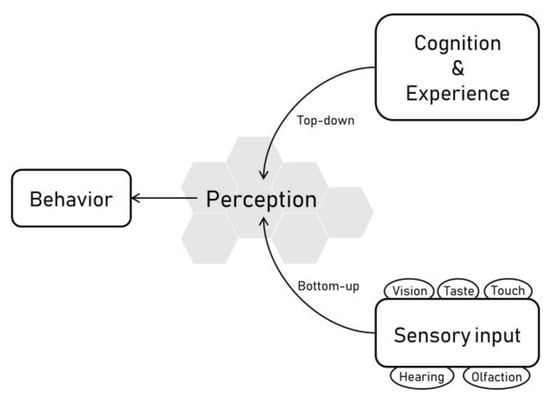 Senses are systems by which animals receive information about their environment. Hearing, vision, olfaction, taste, and touch are the most common sensory modalities of vertebrates [], whereas perception reflects how this information is organized, interpreted, and experienced. It can be explained by two processes: a bottom-up (physical) and a top-down (psychological) (Figure 1). Bottom-up processing reflects the transfer of the information from sensory input, whereas top-down processing refers to the way the information is interpreted based on the knowledge and experience gained through the lifetime [,].