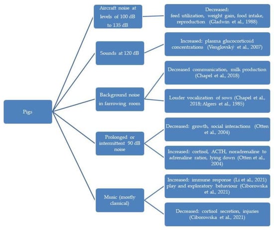 The risk of chronic stress in animals due to prolonged exposure to noise is often overlooked. Long-term exposure to noise may lead to welfare deterioration, behavioral disorders, or the development of anxiety and fear. Noise can cause changes in physiological parameters (acceleration of heart rate, elevation of cortisol levels—[,,], leading to weakened immunity and pathological changes, and consequently reducing productivity (lactation, fattening, delayed oestrus, etc.).