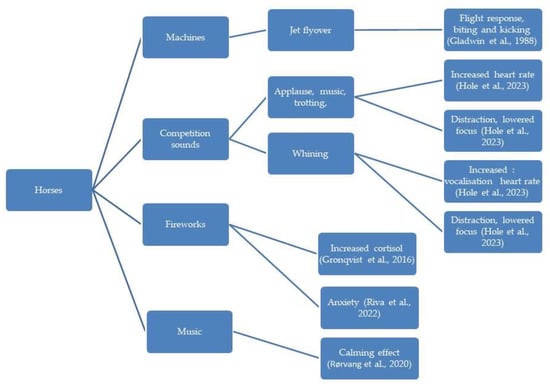 - Riva, M.G.; Dai, F.; Huhtinen, M.; Minero, M.; Barbieri, S.; Dalla Costa, E. The Impact of Noise Anxiety on Behavior and Welfare of Horses from UK and US Owner’s Perspective. Animals 2022, 12, 1319. [Google Scholar] [CrossRef] [PubMed]