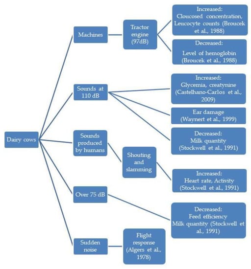 - Broucek, J.; Kovalcikova, M.; Kovalcik, K. Evaluation of Effect of Repeated Noise Stress on Biochemical Indices of Dairy Cows; Scientific Works of RIAP in Nitra; 1988; pp. 85–91. [Google Scholar]