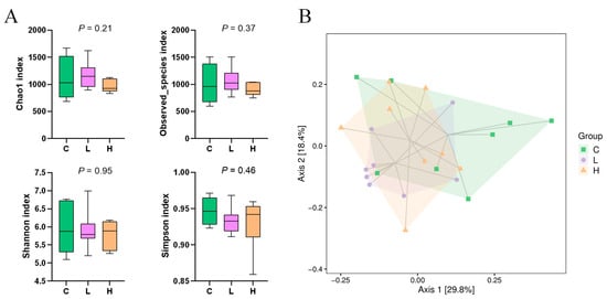Alpha-diversity indices (A) and weighted UniFrac-based PCoA plot (B) of fecal samples of Holstein calves fed either the control (C) or supplemented diet with low-level capsaicin (L) or the supplemented diet with high-level capsaicin (H).