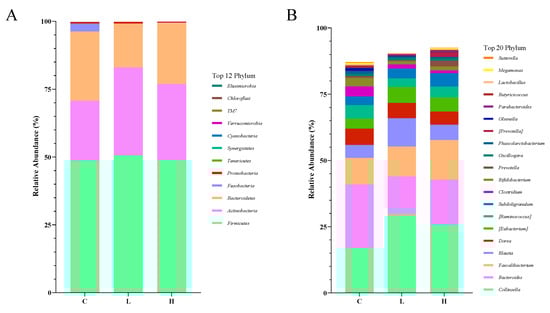 The composition of gut microbiota on phylum (A) and genus (B) level of fecal samples of Holstein calves fed either the control (C) or supplemented diet with low-level capsaicin (L) or the supplemented diet with high-level capsaicin (H).
