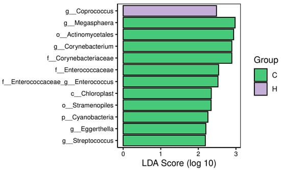 Linear discriminant analysis of effect size (LDA Effect Size, Lefse) allows direct analysis of differences at all taxonomic levels simultaneously, and it has the ability to drill down into different subgroups to pick out marker microbial taxa that behave consistently in different subgroups. In this study, Lefse analysis screened 12 differential bacteria, including one phylum, one order, two families and six genera (Figure 4). In group C, Cyanobacteria, Chloroplast, Stramenopiles, Actinomycetales, Corynebacteriaceae, Enterococcaceae, Corynebacterium, Eggerthella Streptococcus, Enterococcus and Megasphaera were the dominant bacteria. In group H, Coprococcus was the dominant bacterium.