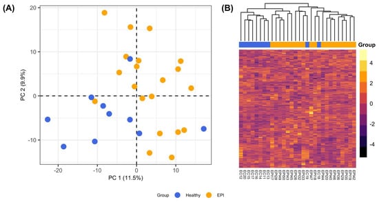 Unsupervised analysis of serum metabolite profiles. Samples are annotated by color according to their group: EPI (orange), healthy (blue). (A) Principal component analysis of relative metabolite abundances. (B) Statistical heatmap of relative metabolite abundances using Euclidian distances and hierarchical clustering.