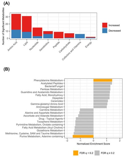 The amino acid and lipid superpathways contained the greatest number of metabolites that varied significantly between the groups (Figure 2A). Metabolite set enrichment analysis was performed to identify metabolic subpathways that were enriched among significantly variable metabolites (the complete results are in Supplementary File S4). After controlling for multiple comparisons, the “Phenylalanine Metabolism” subpathway (NES = 1.42, p = 0.005, q = 0.17) was found to be increased, and the “Purine Metabolism, Adenine containing” subpathway (NES = −1.57, p = 0.002, q = 0.12) was decreased in dogs with EPI (Figure 2B).
