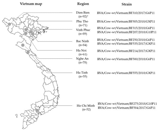 A total of 582 cow diarrhea samples were collected from 8 regions across Vietnam in 2017 and 2018 (sample collection was aided by the veterinary medical college of Hanoi Agriculture University): 222 were collected in 2017 and 360 were collected in 2018. Of these, 92 were collected in Dien Bien, 71 in Phu Thọ, 89 in Vinh Phuc, 61 in Ha Noi, 84 in Bac Ninh, 78 in Nghe An, 55 in Ha Tinh, and 52 in Ho Chi Minh. It could not be determined whether samples were collected from cows vaccinated against BoRVAs. The samples were assigned to 1 of 2 groups based on age: 94 calves aged under 2 months and 488 aged over 2 months. Each cow fecal sample was diluted 1:3 in phosphate-buffered saline and centrifuged (3000× g for 20 min) to obtain a supernatant containing BoRVAs. The supernatant was filtered sequentially through 2 syringe filters (pore size 0.45 μm and 0.22 μm; Minisart® Syringe Filter, Sartorius, Germany) and stored at −80 °C until required. RNA was extracted from the final filtered supernatant sample using an RNeasy mini kit (Qiagen Inc., Germantown, MD, USA). To screen for BoRVAs, the VP6 gene was amplified using real-time PCR []; a Ct value ≤ 33 was considered positive.
