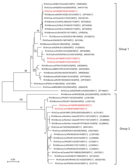 Phylogenetic analysis of the G6 genotype, based on the partial nucleotide sequence of the BoRVA VP7 gene. The phylogenetic tree was constructed for 45 BoRVAs (40 reference sequences and 5 Vietnam sequences) using the maximum likelihood method in the MEGA X program and the Tamura 3-parameter model, with bootstrap values of 1000. The five Vietnamese BoRVAs are highlighted in red.