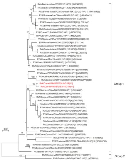 Multiple nucleotide sequence alignments of the detected Vietnamese BoRVAs with the reference BoRVA sequences were performed using CLUSTAL X (ver. 2.1). To ensure accurate phylogenetic tree analysis, the “find best model” function in MEGA X was used to identify an optimal nucleotide substitution model. Phylogenetic tree analysis of VP7 and VP4 was performed using the maximum likelihood (ML) method in MEGA X (Molecular Evolutionary Genetics Analysis X) software [].