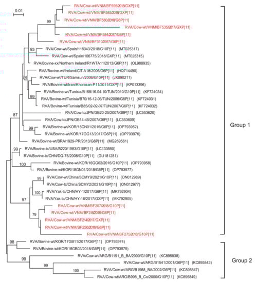 Phylogenetic analysis of the P[11] gene, based on the partial nucleotide sequence of the BoRVA VP4 gene. The phylogenetic tree was constructed for 39 BoRVAs (28 references and 11 Vietnam) using the maximum likelihood method in the MEGA X program and the Tamura 3-parameter model, with bootstrap values of 1000. The 11 Vietnamese BoRVAs are highlighted in red.
