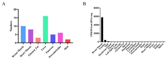 A total of 24,403 genes were detected by integrating and analyzing the collected datasets for tissue-specific high-expression gene screening, with an FPKM value greater than 1000. Statistical analysis revealed the number of genes specifically highly expressed in tissues including the breast muscle, heart muscle, gizzard fat, liver, pancreas, proventriculus and skin (Figure 1A, Table S3). These tissue-specific highly expressed genes are important for identifying gene function and expression characteristics in various tissues [25,26]. As meat production traits are the most economically important traits in broiler production, we focused on genes that are specifically expressed in muscle tissue. We identified a gene called CKM (LOC107051134) that was specifically highly expressed in chicken breast muscle tissue (Figure 1B).