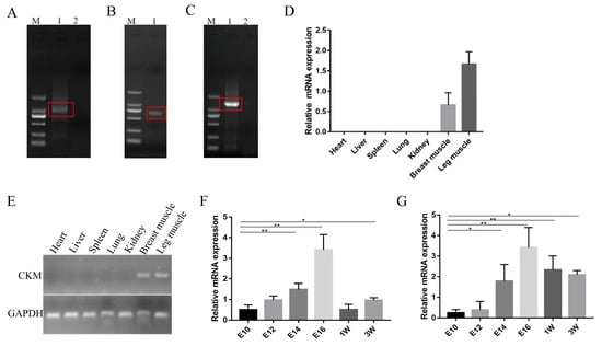 Expression pattern of the CKM gene in chickens. (A) Results of 3′ Rapid amplification of cDNA End (RACE PCR) amplification of CKM; (B) Results of 5′ RACE PCR amplification of CKM; (C) Results of sequence validation of CKM after RACE; (D) quantitative real-time PCR (qPCR) analysis of CKM mRNA expression in various tissues of 1-week-old AA chickens; (E) Semiquantitative analysis of CKM mRNA expression was performed by gel electrophoresis; (F) qPCR analysis of the mRNA expression of CKM in breast muscle tissues of E10 to E16, 1-week-old and 3-week-old AA chickens; (G) qPCR analysis of the mRNA expression of CKM in the leg muscle tissues of E10 to E16, 1-week-old and 3-week-old AA chickens. The values indicated by the bars are the means ± SEM. * p < 0.05; ** p < 0.01.