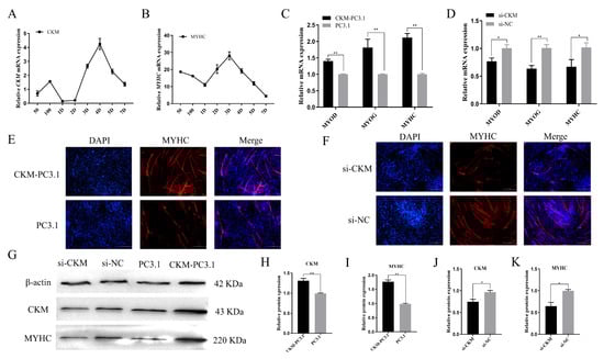 Furthermore, we examined the protein expression levels of CKM and MYHC by WB. As shown in Figure 5G, the expression of the proteins encoded by both CKM and MYHC was highly significantly upregulated after the overexpression of CKM (p < 0.01, Figure 5H,I). In contrast, the levels of the proteins encoded by both CKM and MYHC were significantly decreased after disrupting the CKM expression (p < 0.05, Figure 5J,K). At the translational level, the changes in CKM expression were consistent with the changes in the expression of the differentiation marker MYHC, which more fully shows that the overexpression of CKM could promote myoblast differentiation, while interference with CKM expression showed the inverse effect. In summary, these results suggest that CKM can promote the differentiation of CPMs.
