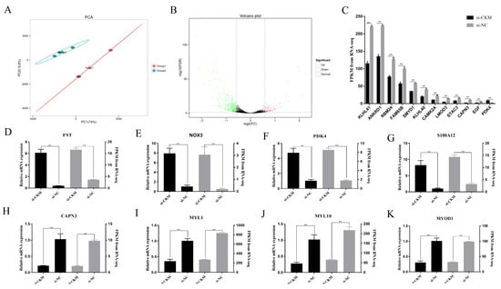 Differentially expressed genes identified by the RNA−seq of CPMs after interference with CKM expression. (A) PCA of RNA−seq data after transfection with si−CKM and si−NC. Group 1 comprised the si−CKM treatment group samples (G22, G23, G24); Group 2 comprised the si−NC control group samples (G14, G15, G16); (B) Volcano plots of differentially expressed genes in the si−CKM and si−NC groups. Green indicates downregulated genes, red indicates upregulated genes and black indicates non-significantly differentially expressed genes; (C) The mRNA expression levels of the differentially expressed genes CAPN3, PDK4, RBM24, SMYD1, KLHL41, KLHL40, STAC3, FAM65B, LMOD3, ANKRD1, EGF and CAMK2A were measured by qPCR after interference with CKM expression; (D–G) The mRNA expression levels of the upregulated genes FST, NOX3, PDK4 and S100A2 were measured by qPCR. The abscissa shows the interference treatment group, the left ordinate shows the gene expression changes detected using qPCR and the right ordinate shows the FPKM values determined by sequencing; (H–K) The mRNA expression levels of the downregulated genes CAPN3, MYL10, MYL1 and MYOD1 were measured by qPCR. The abscissa shows the interference treatment group, the left ordinate shows the gene expression changes detected using qPCR and the right ordinate shows the FPKM values determined by sequencing. The values indicated by the bars are the means ± SEM. ** p < 0.01.