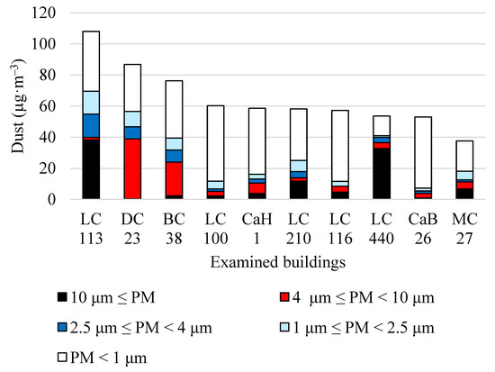 The average mass concentrations (μg·m−3) of airborne dust particles in the examined buildings are in the range above 10 μm, from 4 μm to 10 μm, from 2.5 μm to 4 μm, from 1 μm to 2.5 μm, and smaller than 1 μm.