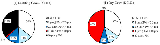 The smallest share of PM1 particles (24%) was in the large-capacity cowshed without straw bedding (LC 440). It is also the smallest in terms of absolute values (PM1 = 12.69 ± 2.82 μg·m−3). Conversely, the largest share (61%) of the largest dust particles above 10 μm was found in this cowshed, LC 440. This is mainly due to the higher airflow speed inside this cowshed. In addition to the natural flow through the mesh walls, 24 axial fans with a horizontal axis of rotation, which help to better ventilate the barn in the summer, are the source of higher flow speeds inside the barn. The PM1 particles are removed by air streams, and the largest particles above 10 μm recirculate inside the barn.