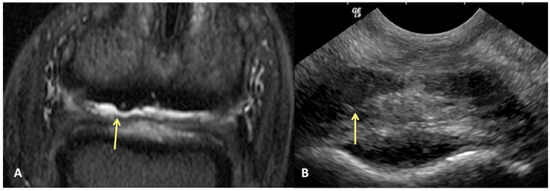 Transverse STIR MR image (A) and corresponding transverse US image (B), obtained at the level of the proximal recess of the navicular bursa. Palmar is on the top of the image, dorsal is on the bottom of the image, lateral is on the left. There is large area of bulging of the dorsal aspect of the lateral lobe of the deep digital flexor tendon (yellow arrows). All MR images are flipped to have the anatomy in the MR and ultrasound images in the same orientation.
