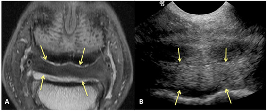 Transverse STIR MR image (A) and corresponding transverse US image (B), obtained at the level of the proximal recess of the navicular bursa. Palmar is on the top of the image, dorsal is on the bottom of the image, lateral is on the left. There is large area of bulging of the dorsal aspect of the lateral lobe of the deep digital flexor tendon (yellow arrows). All MR images are flipped to have the anatomy in the MR and ultrasound images in the same orientation.
