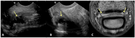 Transverse (A) and sagittal (B) ultrasound images of the lateral aspect of the proximal recess of the navicular bursa and corresponding transverse proton dense MR image (C). There is moderate cffusion and proliferation within the navicular bursa, identified on ultrasound and MRl (yellow arrows). (A) Lateral is on the left, palmar is on the top and dorsal on the bottom of the image. (B) Proximal is on the top of the image, distal is on the bottom. The palmar cortex of the middle phalanx is on the left of the image. (C). Palmar is on the top of the image, dorsal is on the bottom of the image.