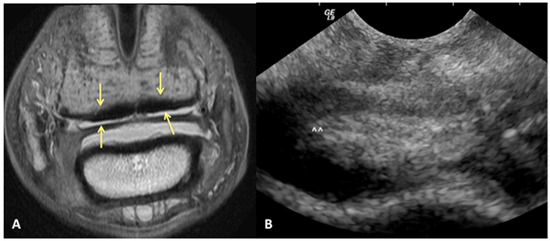 Transverse proton dense MR image (A) and corresponding transverse ultrasound image (B) of the collateral sesamoidean ligament. Palmar is on the top of the image, dorsal is on the bottom of the image, lateral is on the left. There is diffuse (mild) enlargement of the ligament (yellow arrows), positively identified with MRI and ultrasound.