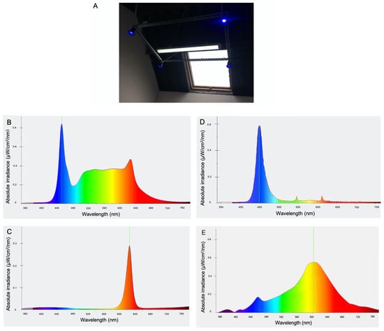 (A) Image showing treatment lighting instalment consisting of white LED fixture (including red LEDs for activation at night) surrounded by four blue LED lamps mounted on a rectangular frame suspended at 3.5 m from floor level. Light spectrum for polychromatic white light (B), red light (C), supplemental blue light (D), and light spectrum provided by incandescent bulb used in control stables (E).