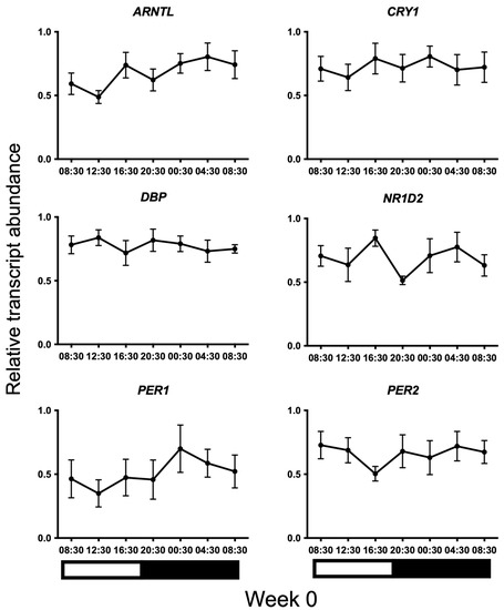 We speculate that failure to detect clock gene oscillations in hair follicles on week 0, and in the control group on week 20, is due to the absence of a sufficiently effective entrainment cue that results in dampened or desynchronised rhythms in this tissue. The first and last samples for some clock genes (taken in the same 24 h clock time) do not show the same mean relative expression level and this is indicative of a non-24-hour oscillation suggesting a nonsynchronised peripheral clock. However, in the case of DBP, NR1D2, and PER1 in the control group on week 20, outside of differences in individual variation, it is unclear why the last sample appears to show lower mean transcript abundance levels than the first sample. Whereas individual neurons in the SCN are capable of maintaining circadian phase coherence in the absence of environmental timing signals [49,50], peripheral tissue clocks rely on daily internal timing signals to maintain rhythm coherence between cells [51]. In the absence of entraining signals, circadian rhythms free-run with a period close to 24 h and this manifests as dampened or desynchronised rhythms in peripheral tissues [6], reflecting a gradual desynchrony of many independent cellular oscillators [51].