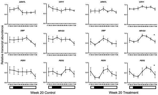 24 h profiles of mRNA expression on Week 20. Plotted are normalised mRNA levels of the candidate genes relative to reference genes GAPDH and PPIA in equine hair follicles in the Control and Treatment lighting groups. Data are presented as means ± SEM. Cosinor analyses revealed significant 24 h variation for NR1D2 and PER2 and approached significance for CRY1 (p = 0.013, p = 0.013, and p = 0.051, respectively) on Week 20 in the treatment group only. * denotes significance at p < 0.05. Light and dark bars represent the light–dark cycle associated with the natural environmental photoperiod during sample collection.