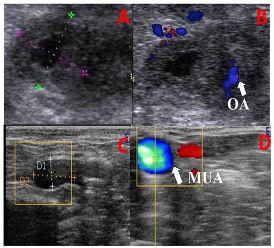 - Cross-sectional diameters (cm) of the ovarian artery (OA; Figure 1A,B) and MUA (Figure 1C,D) were measured using the electronic caliber of an ultrasound device after observing each artery via B-mode ultrasonography.